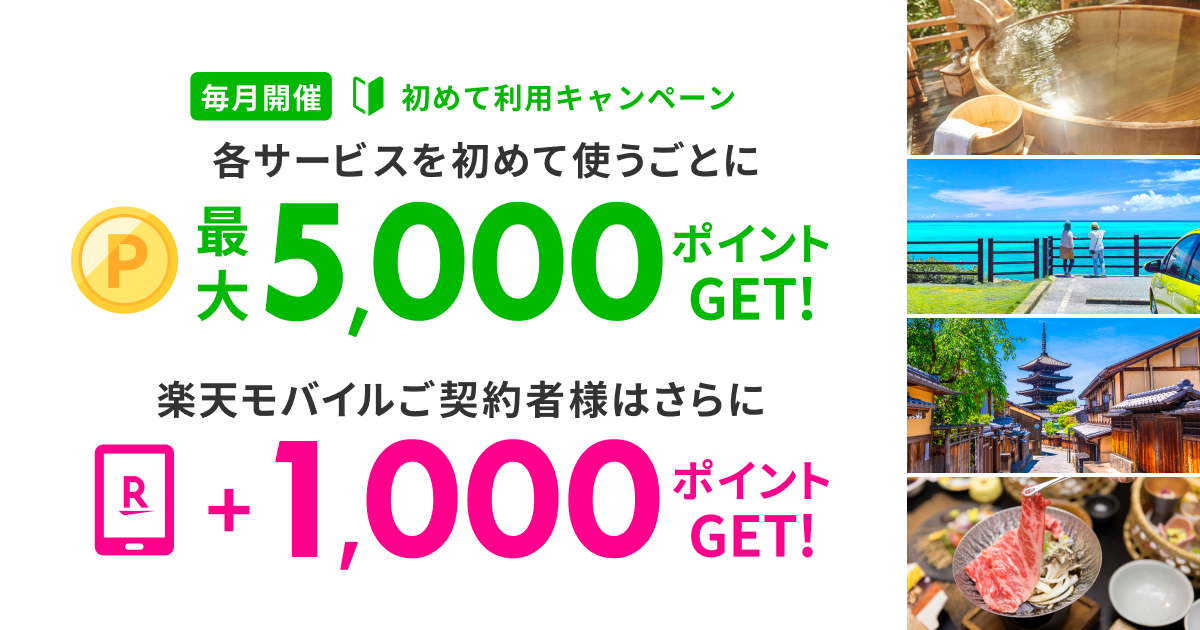 毎月開催されている楽天トラベルのキャンペーンです。楽天モバイルユーザーなら通常会員+1000ポイント多くもらえるキャンペーンです。エントリー、キャンペーンの詳細は以下のページへ。